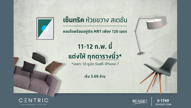 บริษัท เอสซี แอสเสท คอร์ปอเรชั่น จำกัด (มหาชน) จัดโปรโมชั่นพิเศษแต่งให้ทุกตารางนิ้ว ที่โครงการ เซ็นทริค ห้วยขวาง สเตชั่น (Centric Huai Khwang Station) คอนโดพร้อมอยู่ ติดรถไฟฟ้า MRT สถานีห้วยขวาง เพียง 120 เมตร ราคาเริ่มต้นที่ 3.69 ล้านบาท พบกับข้อเสนอสุดพิเศษสำหรับ 10 ยูนิตที่ตกแต่งครบ รับฟรี! iPhone 7 และรับส่วนลด On Top 20,000 บาท พร้อมเครื่องใช้ไฟฟ้า 5 รายการ ลงทะเบียนเพื่อรับสิทธิพิเศษได้แล้ววันนี้