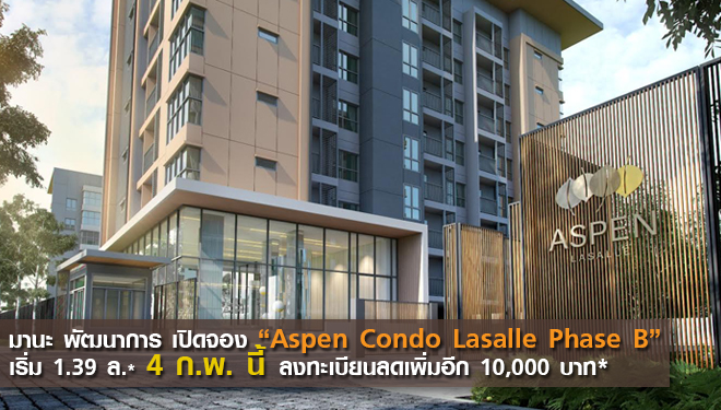 เปิดจอง Aspen Condo Lasalle เฟส B เริ่ม 1.39 ล้าน* 4 ก.พ. นี้ ลงทะเบียนลดเพิ่ม 10,000 บ.*