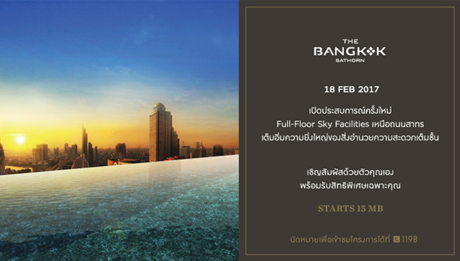 18 ก.พ. 60 นี้ แลนด์แอนด์เฮ้าส์ เปิดคอนโดสุดหรู ใกล้แม่น้ำเจ้าพระยา "เดอะ แบงค็อค สาทร (The Bangkok Sathorn)" ติดทางขึ้นลง สถานี BTS สุรศักดิ์เพียง 800 เมตร เต็มอิ่มกับความยิ่งใหญ่ของสิ่งอำนวยความสะดวกเต็มชั้น ที่สุดความเป็นส่วนตัวด้วย Private Lift พาคุณตรงเข้าสู่ห้องพัก พบกับความสงบของ Green Canopy และผ่อนคลายเป็นสองเท่าที่ Sky Boutique Pool และ Sky Family Pool ราคาเริ่มต้น 15 ล้านบาท