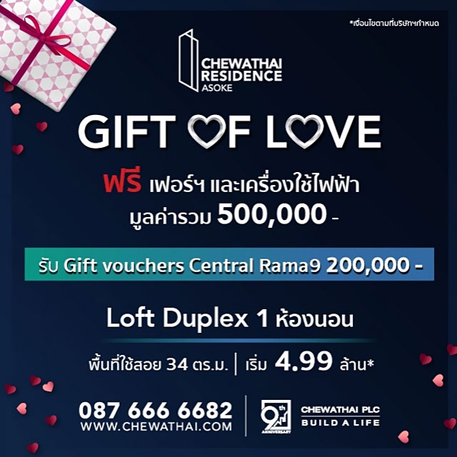 บริษัท ชีวาทัย จำกัด (มหาชน) หรือ "CHEWA" จัดโปรโมชั่นเปิด GIFT OF LOVE สำหรับโครงการ ชีวาทัย เรสซิเดนซ์ อโศก (Chewathai Residence Asoke) มอบของขวัญสุดพิเศษ ต้อนรับเดือนแห่งความรัก ฟรี! เฟอร์ฯ และเครื่องใช้ไฟฟ้า มูลค่ารวม 500,000 บาท* รับ Gift Vouchers Central Rama 9 มูลค่า 200,000 บาท*