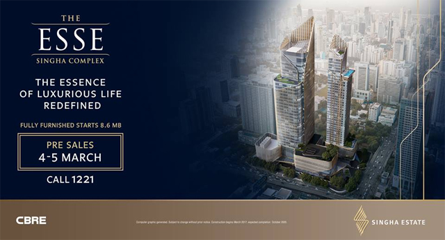 ดิ เอส แอท สิงห์ คอมเพล็กซ์ (The Esse at Singha Complex) คอนโดมิเนียมระดับ Luxury แห่งใหม่จาก บริษัท สิงห์ เอสเตท จำกัด (มหาชน) โครงการตั้งอยู่ใกล้แยกเพชรบุรี เป็นคอนโด High Rise อาคารชุดพักอาศัยสูง 39 ชั้น 1 อาคาร รวมห้องพักอาศัย 319 ยูนิต มีแบบห้องให้เลือกตั้งแต่ 1 ห้องนอน, 2 ห้องนอน และเพนท์เฮาส์ ขนาดพื้นที่ใช้สอย 34.50 - 215.0 ตร.ม. พรั่งพร้อมด้วยสิ่งอำนวยความสะดวก พร้อมที่จอดรถพิเศษสำหรับซูเปอร์คาร์ และซูเปอร์ไบค์ และพื้นที่สีเขียวภายในโครงการ ราคาเริ่มต้น 8.6 ล้าน เปิดตัว พร้อม Pre Sales ในวันที่ 4-5 มีนาคม 2560