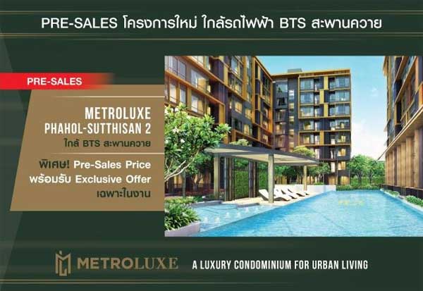 เมโทรลักซ์ พหล - สุทธิสาร (Metro Luxe Phahol-Sutthisan) ใกล้รถไฟฟ้า BTS สถานีสะพานควาย เดินทางเข้าออกสะดวกทั้งจากถนนวิภาวดีและถนนพหลโยธิน เป็นคอนโดสูง 8 ชั้น จำนวน 2 อาคาร รวม 317 ยูนิต ห้องพักอาศัยแบบ 1 ห้องนอน มีพื้นที่ใช้สอยเริ่มต้นที่ 25.5 ตร.ม. และ แบบ 2 ห้องนอน เริ่มต้นที่ 52.8 ตร.ม. พร้อมได้รับการออกแบบภายใต้คอนเซปต์หรู Zense of Luxury ทำให้สภาพแวดล้อมโครงการร่มรื่น และยังเต็มไปด้วยสิ่งอำนวยความสะดวก อาทิ สวนสไตล์ Modern Zen ที่มีดีไซน์ทางเดินสวยแบบ Step by Step, สระว่ายน้ำขนาดใหญ่พร้อมมุมพักผ่อนแบบ Onzen Mood ราคาเริ่มต้นที่ 2.45 ล้านบาท พิเศษ! Pre-Sale Price พร้อมรับ Exclusive Offer เฉพาะในงาน