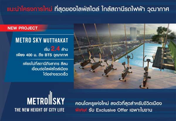 เมโทร สกาย วุฒากาศ (Metro Sky Wutthakat) เป็นคอนโดสูง 32 ชั้น จำนวน 1 อาคาร รวม 624 ยูนิต เพียง 400 เมตรจากรถไฟฟ้า BTS สถานีวุฒากาศ เดินทางสู่ศูนย์กลางธุรกิจอย่างสีลม หรือสาทร ได้อย่างรวดเร็ว ออกแบบพิเศษให้ทุกห้องพักสามารถชมวิวเมืองสวยได้ โดยห้องพักแบบสตูดิโอขนาดพื้นที่ใช้สอยเริ่มที่ 24 ตร.ม. แบบ 1 ห้องนอน เริ่มต้นที่ 24 ตร.ม. และ 2 ห้องนอน เริ่มต้นที่ 49 ตร.ม. ทันสมัยด้วยอาคารจอดรถสูง 5 ชั้นพร้อมระบบ Automatic Parking Building พื้นที่ส่วนกลางโดดเด่นด้วย Mezzanine ที่รายล้อมด้วยวิวสวนธรรมชาติ พร้อมด้วยสิ่งอำนวยความสะดวกมากมายในคอนเซปต์ Sky Facilties บนยอดตึก รวมทั้งยังมี Front Pool ขนาดใหญ่ ราคาเริ่มต้นที่ 2.40 ล้านบาท พิเศษ! รับ Exclusive Offer เฉพาะในงาน