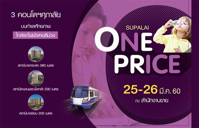บริษัท ศุภาลัย จำกัด (มหาชน) จัดโปรโมชั่นสุดคุ้มที่คุณไม่ควรพลาด! "Supalai One Price" ราคาเดียวเท่านั้น เอาใจลูกค้าที่กำลังมองหาโครงการคอนโดมิเนียมคุณภาพพร้อมอยู่ พบกับ 3 คอนโดฯศุภาลัย บนทำเลศักยภาพ ติดถนนใหญ่ ใกล้รถไฟฟ้าสายสีม่วง ตั้งแต่วันที่ 25 - 26 มีนาคม นี้ ณ สำนักงานขาย