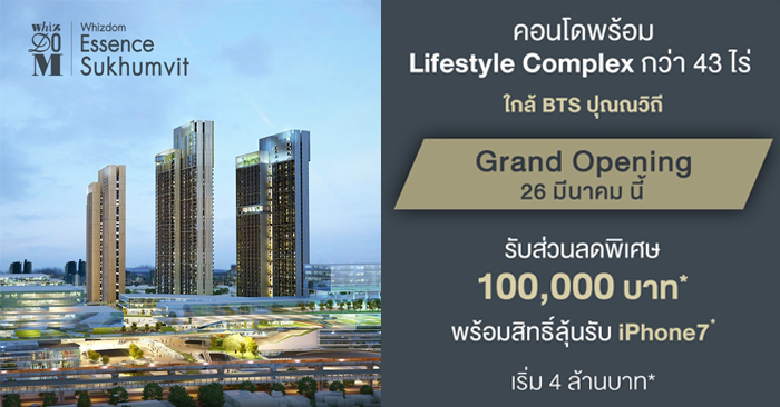 "Whizdom Essence Sukhumvit" Grand Opening 26 มี.ค.นี้ ลุ้นรับ iPhone 7 พร้อมส่วนลด 100,000*