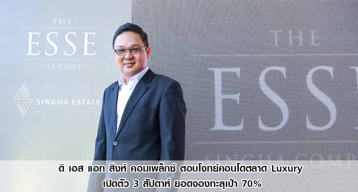 นายณัฐวุฒิ มัธยมจันทร์ ประธานเจ้าหน้าที่บริหารการพัฒนาธุรกิจพักอาศัย บริษัท สิงห์ เอสเตท จำกัด (มหาชน) เปิดเผยว่า หลังจากที่โครงการ ดิ เอส แอท สิงห์ คอมเพล็กซ์ (The Esse at Singha Complex) คอนโดมิเนียมลักชัวรี่ โครงการที่ 2 ของสิงห์ เอสเตท ได้เปิดพรีเซลล์ไปเมื่อ 4-5 มีนาคม ที่ผ่านมา โครงการฯ ได้รับผลตอบรับอย่างดีเกินคาด โดยขณะนี้มียอดจองไปแล้วกว่า 70% จากเปิดขายเพียง 3 สัปดาห์