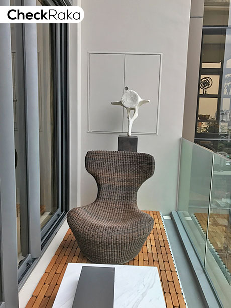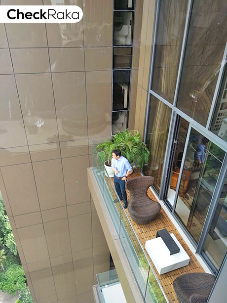 ภาพตัวอย่างความกว้างของระเบียง และวิวโครงการมุมสูงโดยรอบ