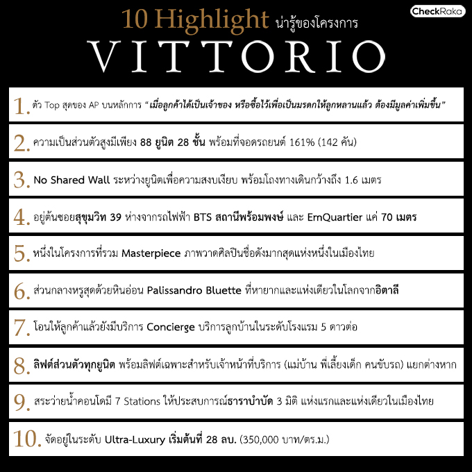 บริษัท เอพี (ไทยแลนด์) จำกัด (มหาชน) พร้อมเผยโฉม "VITTORIO" (วิตโตริโอ) คอนโดมิเนียมระดับอัลตร้า-ลักซ์แห่งใหม่ ภายใต้แนวคิด 'LIVING IN THE MASTERPIECE' ที่สุดของที่สุดในทุกมิติ ที่ซึ่งสุนทรียะผสานเข้ากับการใช้ชีวิตได้อย่างสมบูรณ์แบบมูลค่าโครงการกว่า 3,500 ล้านบาท เอพี (ไทยแลนด์) ชูความเป็นเลิศในเรื่องของทำเล ราคา คุณค่าของงานศิลป์ การออกแบบ และการดูแลรักษาให้คงคุณค่าเสมือนครั้งแรกพบ ทั้งให้ความสำคัญสูงสุดกับความเป็นส่วนตัวของผู้อยู่อาศัย โดยมีจำนวนเรสซิเดนซ์ เพียง 88 ยูนิต ภายในอาคารที่พักอาศัยความสูง 28 ชั้น ครบครันด้วยสิ่งอำนวยความสะดวก ที่สามารถตอบโจทย์ทุกความต้องการของผู้อยู่อาศัยระดับอัลตร้า-ลักซ์