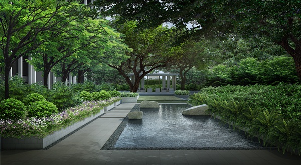 ที่สำคัญทางโครงการมีการปรับทัศนียภาพของงาน Landscape ในรูปแบบใหม่โดยยกระดับแนวดินบริเวณตามริมขอบรั้วให้สูงกว่าด้านในและเมื่อรวมกับต้นไม้ใหญ่ดังกล่าวแล้ว ก็จะช่วยในเรื่องของการลดเสียงการสัญจรของเรือและรถบนทางด่วนอีกด้วย อีกทั้งลูกบ้านก็จะได้ซึมซับกับทัศนียภาพของธรรมชาติแบบเต็มตาเมื่อมองผ่านจากLobby ในตัวอาคาร
