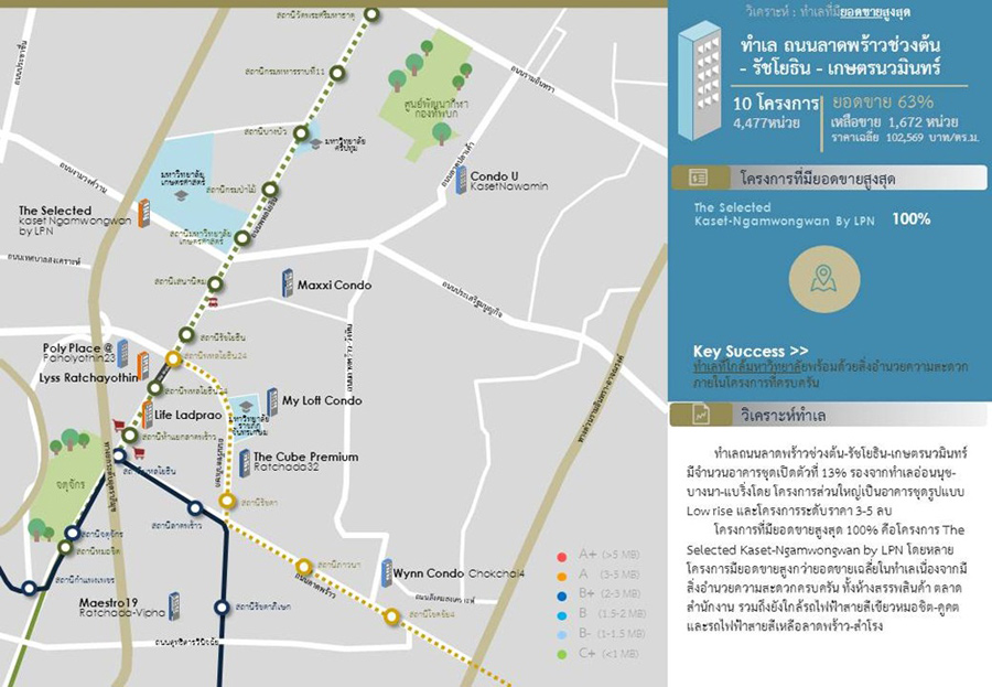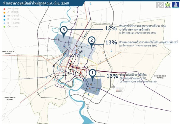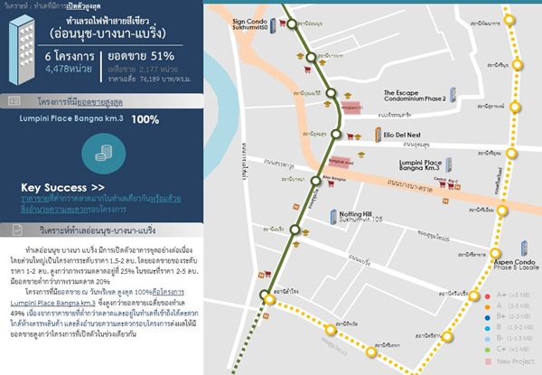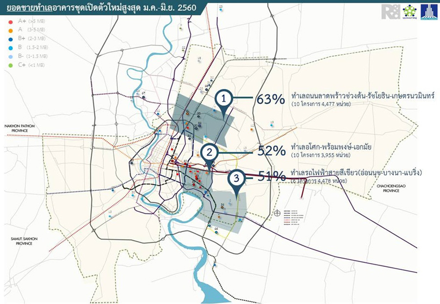 - ทำเลที่มีการเปิดตัวสูงสุด คือทำเลรถไฟฟ้าสายสีเขียว อ่อนนุช-บางนา-แบริ่ง