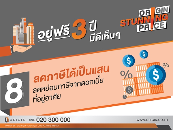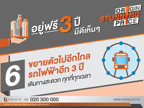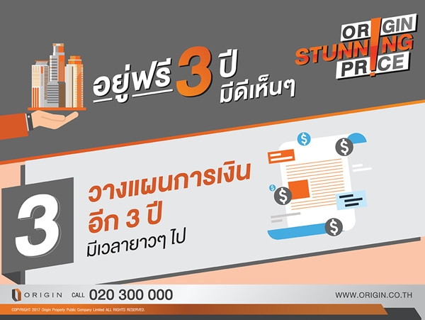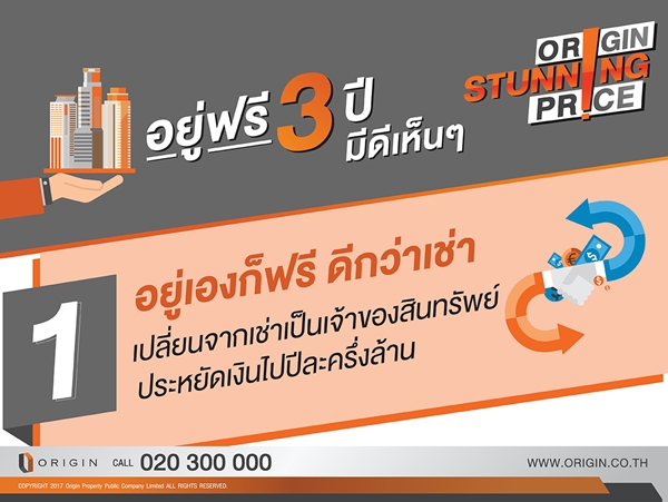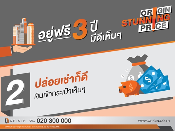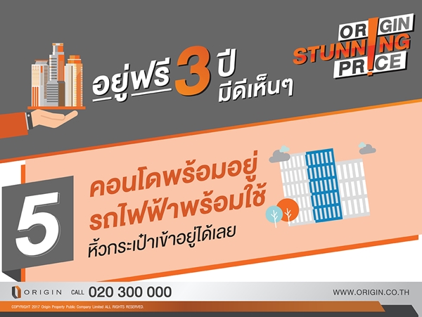 ออริจิ้น มอบโอกาสเดียวกับข้อเสนอที่ดีที่สุด คอนโดแนวรถไฟฟ้ากว่า 10 โครงการ แต่งครบพร้อมอยู่ฟรี 3 ปี ALL FREE เพียงคุณจอง Origin ผ่อนให้ อยู่ฟรี 3 ปี (เริ่มผ่อนปีที่ 4) พบกัน 17 - 20 สิงหาคมนี้ ที่พารากอน และศูนย์ประชุมสิริกิติ์ ลงทะเบียนรับสิทธิพิเศษวันนี้ - 20 สิงหาคม นี้เท่านั้น (เพียง 50 ห้องเท่านั้น)