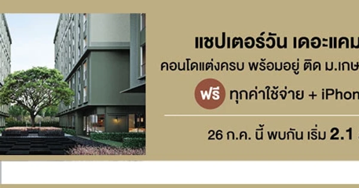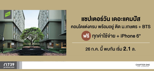 "แชปเตอร์วัน เดอะ แคมปัส เกษตร (Chapter One The Campus Kaset)" คอนโดพร้อมอยู่ ใกล้ม.เกษตรศาสตร์ ติดแนวรถไฟฟ้าสายสีเขียวเข้ม (สายในอนาคต) จาก บริษัท พฤกษา เรียลเอสเตท จำกัด (มหาชน) ลักษณะเป็นคอนโด Low Rise สูง 8 ชั้น 7 อาคาร บนเนื้อที่กว่า 7 ไร่ เริ่มต้นบทใหม่ของชีวิตที่ แชปเตอร์วัน เดอะ แคมปัส บนถนนพหลโยธิน ครบทุกความต้องการของชีวิตด้วยแนวคิดแบบ Knowledge Community พร้อม Fully-Furnished อย่างมีสไตล์แบบ Soft Loft จองวันนี้แค่ 30,000 บาท ฟรี !! ทุกค่าใช้จ่าย + iPhone 6*