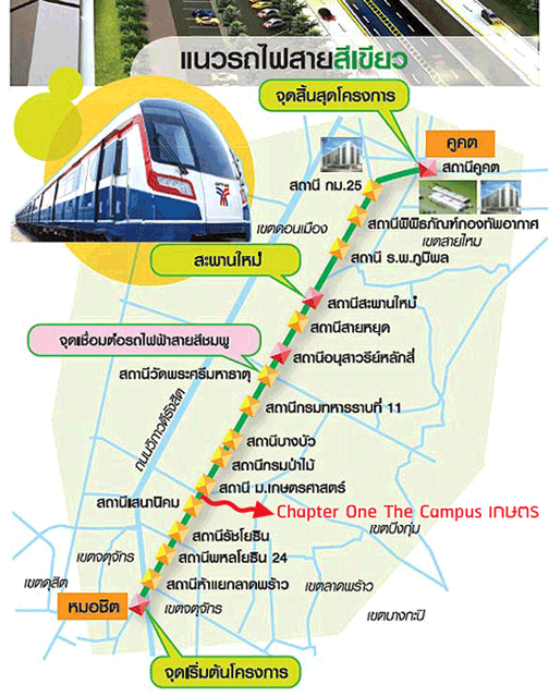 ทำเลศักยภาพบนถนนพหลโยธิน ห่างจากม.เกษตร เพียง 150 เมตร ติดแนวรถไฟฟ้าส่วนต่อขยายสายสีเขียวเข้มระหว่างสถานีม.เกษตรฯ และสถานีเสนานิคม (สายในอนาคตที่ต่อมาจาก BTS หมอชิต แต่กว่าจะเสร็จคงอีกไม่ต่ำกว่า 5-6 ปี เป็นอย่างน้อย) ใกล้สถานที่สำคัญมากมาย เช่น