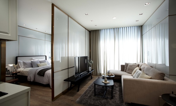 ภาพบรรยากาศห้องตัวอย่าง แบบ 1 ห้องนอน บริเวณห้องนั่งเล่น