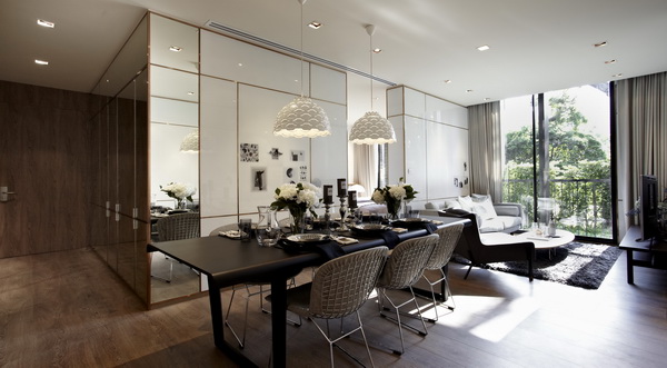 ภาพบรรยากาศห้องตัวอย่าง แบบ 3 ห้องนอน ส่วนทานข้าวตั้งอยู่ตรงกลางห้องเชื่อมต่อกันส่วนของห้องนั่งเล่น