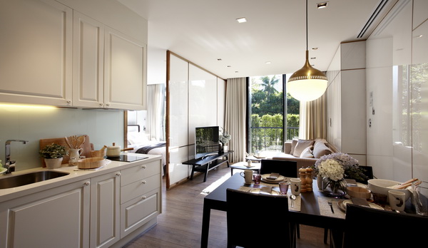 ภาพบรรยากาศห้องตัวอย่าง แบบ 1 ห้องนอน บริเวณส่วนทานอาหาร และห้องครัว ซึ่งเป็นครัวแบบเปิด
