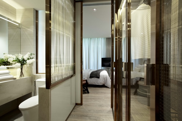 ภาพบรรยากาศห้องตัวอย่าง แบบ 1 ห้องนอน บริเวณห้องน้ำ ด้านหน้าห้องน้ำเป็น walk in closet