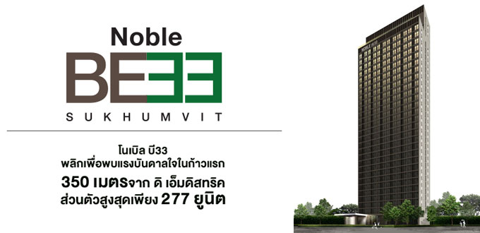 โครงการ โนเบิล บี เทอร์ตี้ทรี (Noble BE33) คอนโดมิเนียมระดับไฮเอนด์ใจกลางสุขุมวิท ซึ่งเป็นโปรเจกต์แรกในปีนี้ของบริษัท โนเบิล ดีเวลลอปเมนท์ จำกัด (มหาชน) โดย Noble BE33 เป็นคอนโดมิเนียมใหม่ใจกลางแหล่งไลฟ์สไตล์ทุกรูปแบบบนถนนสุขุมวิท33 ภายใต้สโลแกน "FLIP TO REVEAL YOURSELF พลิกให้พบตัวคุณ" เพียง 320 เมตรจาก Sky Walk และ BTS พร้อมพงษ์ (ทางขึ้นลงอนาคต)