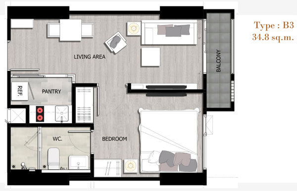 Unit Plan ห้องแบบ 1 ห้องนอนขนาด 34.80 ตร.ม.