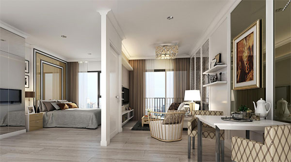 ห้องพักอาศัยตกแต่งในสตไล์ Modern Tropical ออกแบบให้เพดานสูงโปร่ง ทุกห้อง Unblock View สามารถชมความงามของวิวเมืองสวยๆ จากมุมที่แตกต่างกัน มีรูปแบบให้เลือก 2 แบบด้วยกัน