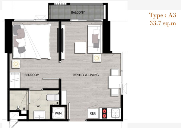 Unit Plan ห้องแบบ 1 ห้องนอนขนาด 33.70 ตร.ม.