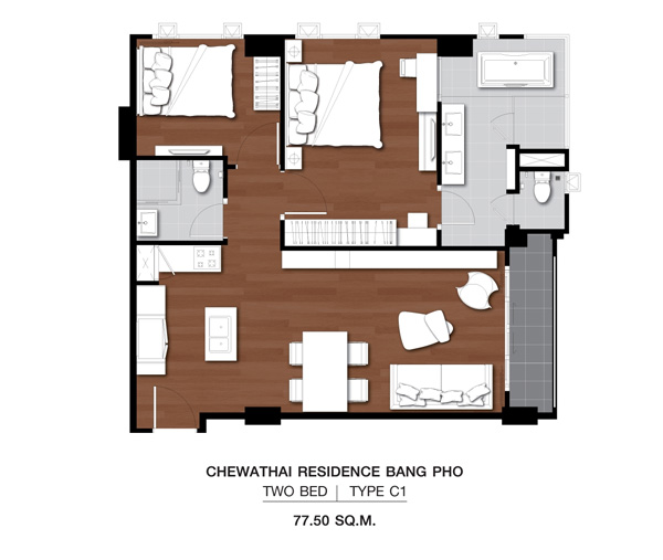 - แบบ 2 ห้องนอน พื้นที่ใช้สอยขนาด ขนาด 68.0 - 78.5 ตร.ม.