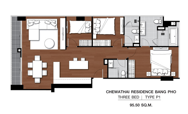 - แบบ 3 ห้องนอน พื้นที่ใช้สอยขนาด ขนาด 95.5 - 117.0 ตร.ม.