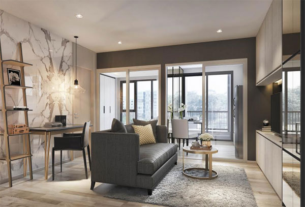 ภาพจำลองบรรยากาศภายในห้องนั่งเล่น ของห้องแบบ 1 ห้องนอน
