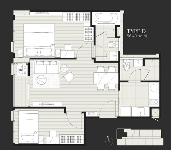 - แบบ 2 ห้องนอน พื้นที่ใช้สอยขนาด 56.40 ตร.ม.