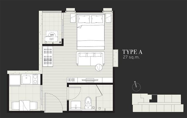 การจัดพื้นที่ภายในห้องพักมีการแยกพื้นที่ส่วนเตรียมอาหารออกจากส่วน Living Area เป็นสัดส่วนชัดเจน เพื่อให้ได้พื้นที่พักผ่อนกลับคืนมามากขึ้น โดยมีห้องให้เลือกด้วยกัน 3 Type คือ