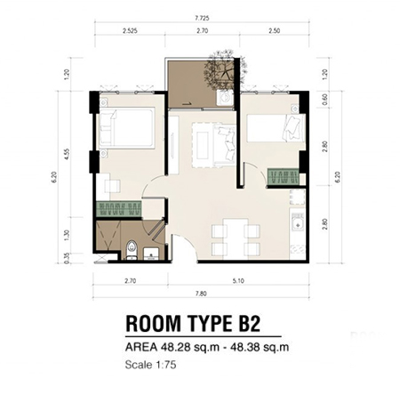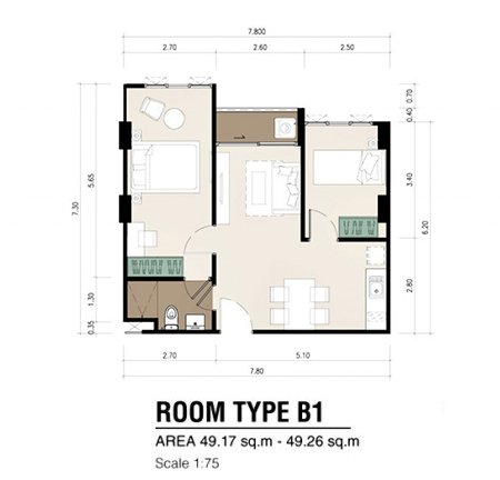 - แบบ 2 ห้องนอน ขนาดพื้นที่ใช้สอยตั้งแต่ 45.28 - 49.26 ตร.ม.