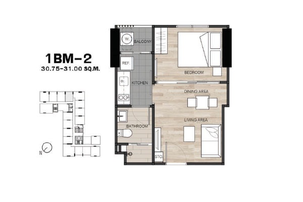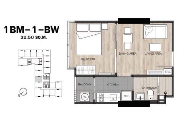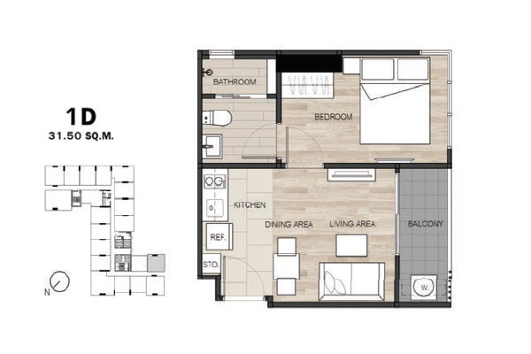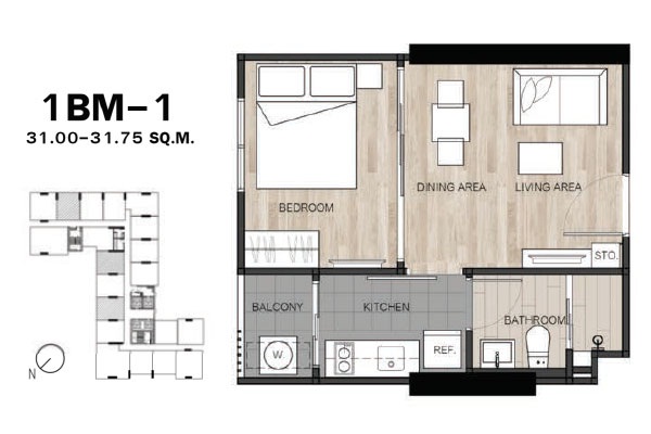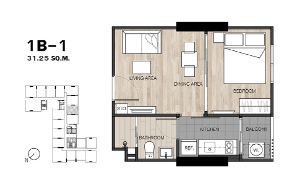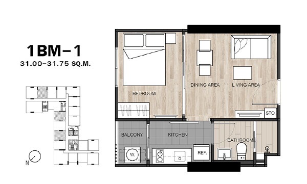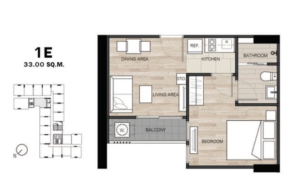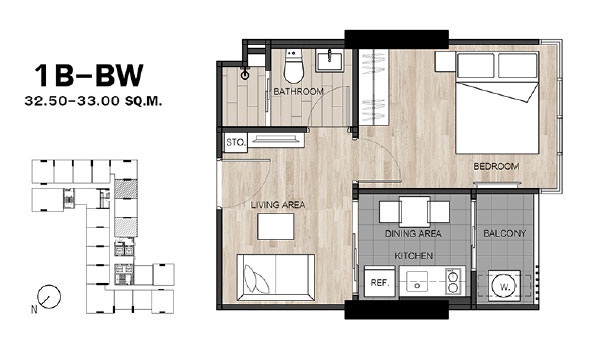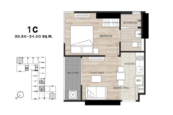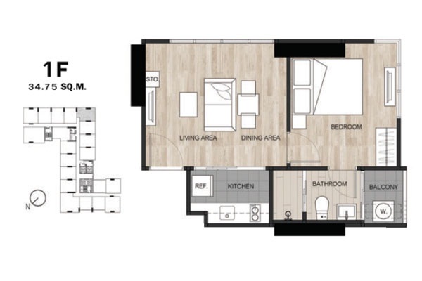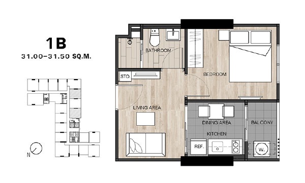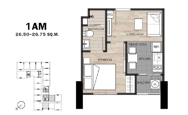 - แบบ 1 ห้องนอน ขนาดพื้นที่ใช้สอย 26.5 - 34.75 ตร.ม.