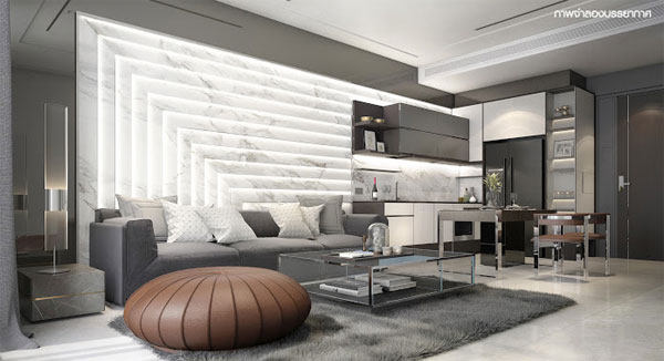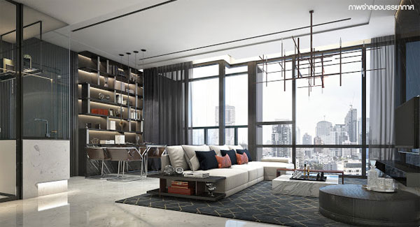 ภาพจำลองบรรยากาศภายในห้องนั่งเล่นของห้องแบบ 1 ห้องนอน
