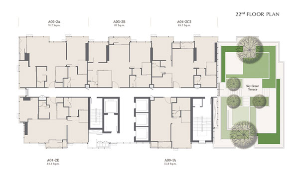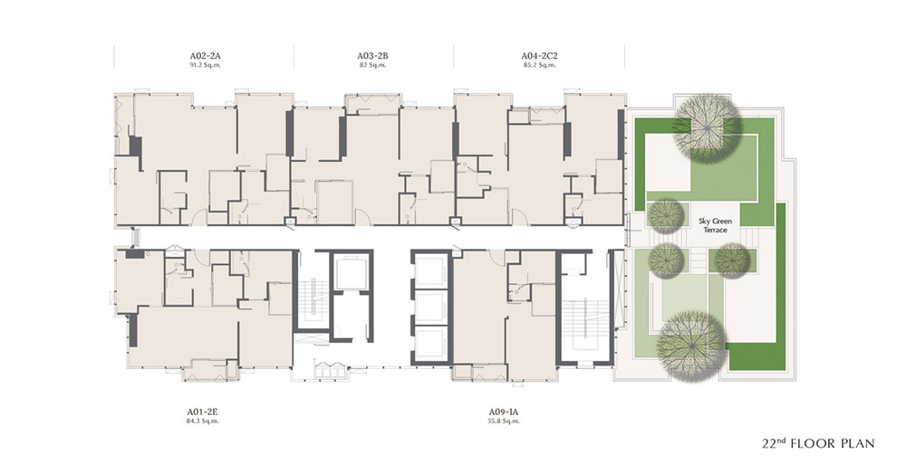 - 2 ห้องนอน พื้นที่ใช้สอยขนาด 91-94 ตร.ม. ตำแหน่งหัวมุมที่สามารถได้วิวสองทิศทาง