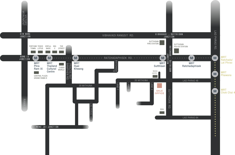 โครงการตั้งอยู่ใจกลางรัชดา ใกล้ MRT สุทธิสาร ประมาณ 1 กิโลเมตร อยู่ในซอย 20 มิถุนา แยก 3 ซึ่งเป็นเส้นทางลัดจากถนนสุทธิสารไปยังถนนประชาอุทิศ สามารถออกไปถนนประดิษฐ์มนูธรรมได้ โครงการนี้ใกล้ถนนใหญ่รัชดาภิเษก และสี่แยกสุทธิสาร เป็นศูนย์รวมอาคารสำนักงานต่างๆ และแหล่งช้อปปิ้งมอลล์ต่างๆ มากมาย ได้แก่