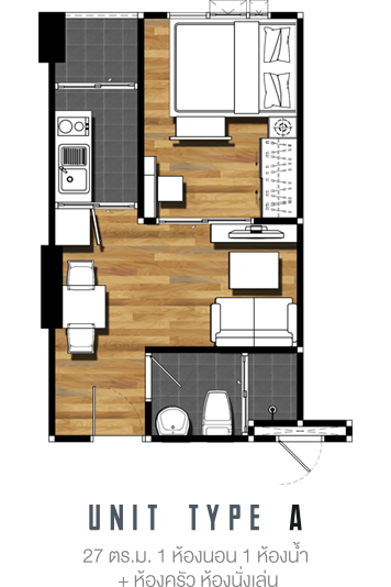 เป็นแบบ 1 ห้องนอน 1 ห้องน้ำ ขนาด 27 ตารางเมตร มี 2 แบบ ดังนี้