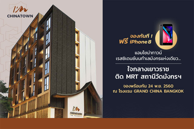 บริษัท แกรนด์ ยูนิแลนด์ จำกัด เตรียมเปิดจอง คอนโด แอมไชน่าทาวน์ เรสซิเดนซ์ (I'm China Town Residence) ไพรเวท เรสซิเดนซ์ แต่งครบ สไตล์ MODERN CHINESE ใจกลางเยาวราช ตอบโจทย์ไลฟ์สไตล์คนเมืองยุคใหม่ เริ่มเพียง 2.9 ล้านบาท วันที่ 24 พ.ย. นี้ ที่โรงแรมแกรนด์ไชน่า เยาวราช ห้องบอลรูม ชั้น 10 เวลา 10.00 น. - 18.00 น.