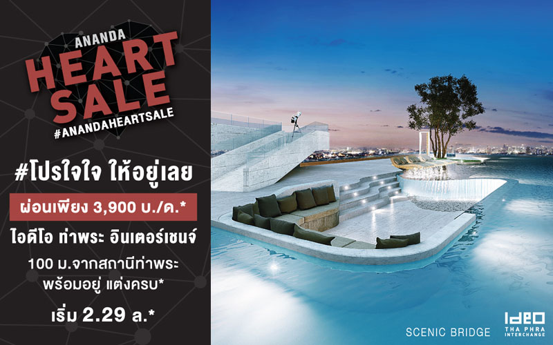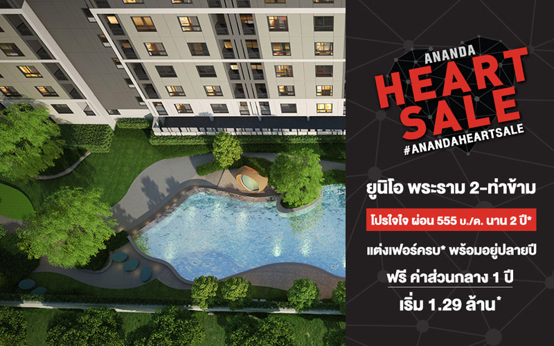 โปรโมชั่น : Ananda Heart Sale #โปรใจใจ ผ่อน 555 บ./ด. นาน 2 ปี* แต่งเฟอร์ครบ* พร้อมอยู่ ปลายปี ฟรีค่าส่วนกลาง 1 ปี*