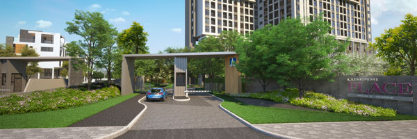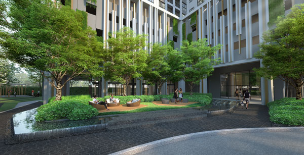 ภาพจำลองบรรยากาศทางเข้าออกโครงการ ปลูกไม้ประดับเพิ่มความร่มรื่น