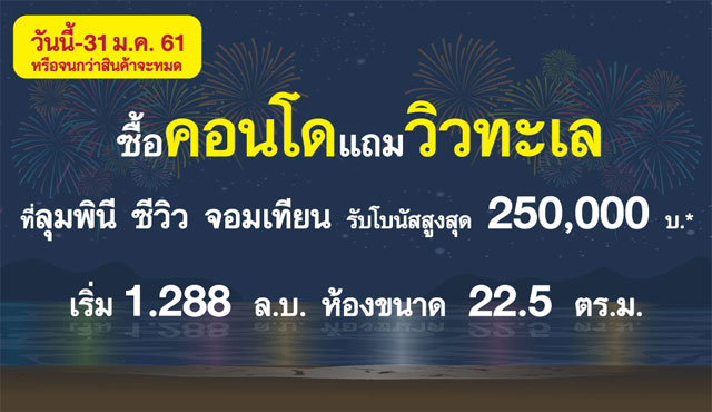 บริษัท แอล.พี.เอ็น. ดีเวลลอปเมนท์ จำกัด (มหาชน) หรือลุมพินี มอบความสุขส่งท้ายปี ซื้อคอนโดแถมวิวทะเล สมดุลระหว่างธรรมชาติและการอยู่อาศัยที่ ลุมพินี ซีวิว จอมเทียน (Lumpini Sea view Jomtien) โปรโมชั่นพิเศษ! รับโบนัสสูงสุด 250,000 บ.* ราคาเริ่มต้น 1.288 ล้านบาท* สำหรับห้องขนาด 22.5 ตร.ม. (จำนวนจำกัด) ตั้งแต่วันนี้ - 31 ม.ค. 2561 หรือจนกว่าสินค้าจะหมด
