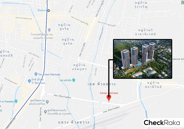 โครงการ Artisan Ratchada ตั้งอยู่บนถนนเทียนร่วมมิตร แขวงห้วยขวาง เขตห้วยขวาง กรุงเทพฯ ทำเลทองย่านรัชดา ใจกลางเมืองธุรกิจ (New CBD) การเดินทางสะดวกใกล้รถไฟฟ้า MRT สายสีน้ำเงิน สถานีห้วยขวาง, Airport Link และทางด่วน นอกจากนี้โดยรอบโครงการยังรายล้อมด้วยห้างสรรพสินค้า โรงพยาบาล และสถานศึกษาชั้นนำ อาทิ