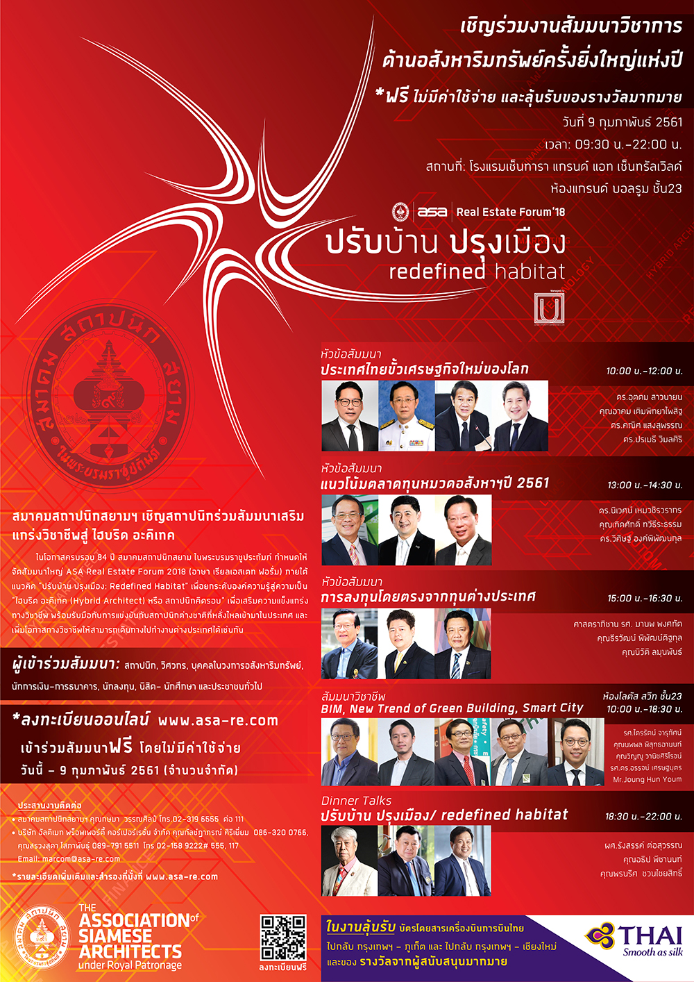 ในโอกาสครบรอบ 84 ปี สมาคมสถาปนิกสยาม ในพระบรมราชูปถัมภ์ ร่วมกับ บริษัท อัลติเมท พร๊อพเพอร์ตี้ คอร์เปอเรชั่น จำกัด (UPC) กำหนดจัดงานสัมมนาใหญ่ "ASA Real Estate Forum 2018" (อาษา เรียล เอสเตท ฟอรั่ม) ภายใต้แนวคิด "ปรับบ้าน ปรุงเมือง: Redefined Habitat" ในวันที่ 9 กุมภาพันธ์ 2561 ณ ห้อง World Ballroom โรงแรม เซ็นทารา แกรนด์ แอท เซ็นทรัลเวิลด์ เพื่อเป็นเวทีแลกเปลี่ยนความคิดแบบบูรณาการ และประสานเครือข่ายทางวิชาการจากผู้ทรงคุณวุฒิที่เกี่ยวข้องกับภาคธุรกิจอสังหาริมทรัพย์ เพื่อร่วมกันยกระดับองค์ความรู้ให้แก่สถาปนิก วิศวกร และผู้ประกอบการอสังหาริมทรัพย์ไทยสู่มาตรฐานสากล