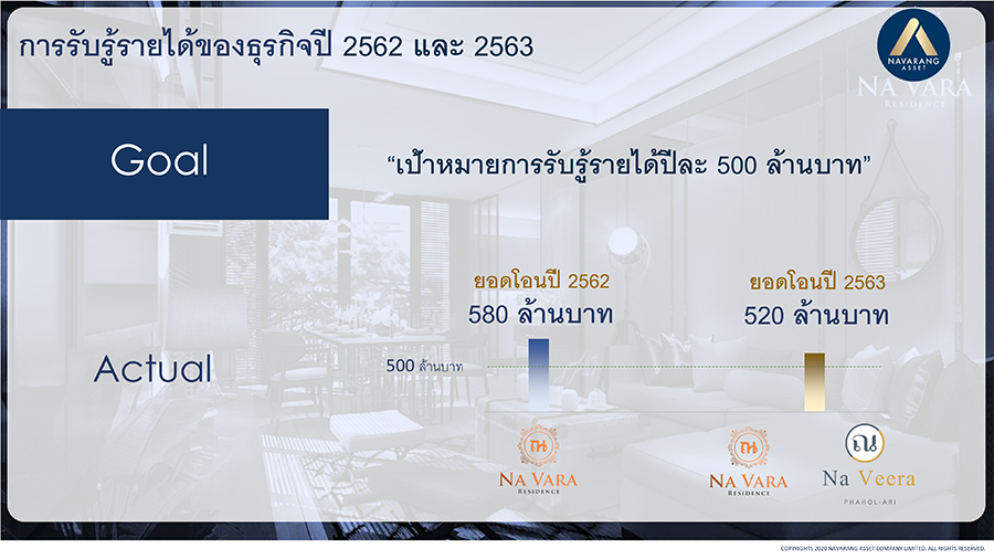 นายอภิภู พรหมโยธี ประธานเจ้าหน้าที่บริหาร บริษัท ณวรางค์ แอสเซท จำกัด (Mr. Apipu Phromyothi, Chief Executive Officer of Navarang Asset Co., Ltd.) ผู้พัฒนาอสังหาริมทรัพย์ที่ออกแบบโครงการเพื่อตอบโจทย์ความต้องการของผู้อยู่อาศัยตามไลฟ์สไตล์คนรุ่นใหม่ เปิดเผยถึงภาพรวมการดำเนินงานของบริษัทในช่วงที่ผ่านมาว่า ยังคงสามารถดำเนินธุรกิจไปตามแผนการดำเนินงานที่ตั้งไว้ ซึ่งตั้งเป้ายอดรายได้ทั้งปี 2563 ไว้ที่ประมาณ 500 ล้านบาท ในปี 2562 บริษัทฯ รับรู้รายได้หลักจากโครงการ ณ วรา เรสซิเดนซ์ (Na Vara Residence) ประมาณ 580 ล้านบาท และในปี 2563 บริษัทฯ รับรู้ยอดโอนโครงการ ณ วรา เรสซิเดนซ์ (Na Vara Residence) และ โครงการ ณ วีรา พหลฯ-อารีย์ (Na Veera Phahol-Ari) รวมประมาณ 520 ล้านบาท พร้อมกันนี้ยังได้ทำการเปิดตัว โครงการ ณ รีวา เจริญนคร (Na Reva Charoennakhon) ไปเมื่อช่วงต้นปี 2563 ซึ่งนับว่าได้กระแสตอบรับที่ดีจากลูกค้าทั้งชาวไทยและชาวต่างชาติ ปัจจุบันโครงการนี้ได้รับอนุมัติรายงานวิเคราะห์ผลกระทบด้านสิ่งแวดล้อมเป็นที่เรียบร้อยแล้ว (EIA Approved) อีกทั้งได้ร่วมมือกับ Dusit Hospitality Services (DHS) ในส่วนของการให้บริการกับลูกบ้านภายใต้มาตรฐานดุสิต "Guest Service Standards Trained by Dusit"