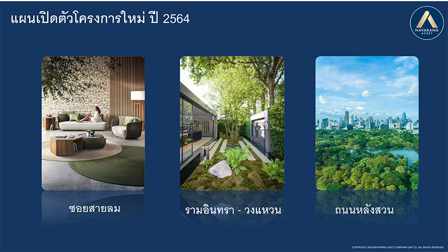 ด้าน นายองคฤทธิ์ พรหมโยธี ประธานบริหารฝ่ายปฏิบัติการ บริษัท ณวรางค์ แอสเซท จำกัด (Mr. Onkarit Phromyothi, Chief Operating Officer of Navarang Asset Co., Ltd.) กล่าวว่า สำหรับ ทั้ง 3 โครงการที่กำลังจะเปิดขายในปี 2564 ได้แก่ โครงการ ณ ไอรา สายลม-อารีย์ (Na Ira Sailom-Ari) เป็น Vertical Residence สูง 7 ชั้น จำนวนเพียง 5 ยูนิต ตั้งอยู่ในซอยสายลม (พหลโยธิน ซ.8) มูลค่ารวม 220 ล้านบาท พื้นที่ใช้สอยมากกว่า 400 ตารางเมตร/ยูนิต ราคาเริ่มต้น 38 ล้านบาท โครงการ รามอินทรา-วงแหวน บ้านเดี่ยว จำนวน 18 ยูนิต มูลค่ารวม 280 ล้านบาท ขนาดพื้นที่เริ่มต้น 60 ตารางวา ราคาขายเฉลี่ย 15 ล้านบาท ทั้ง 2 โครงการจะเริ่มเปิดขายประมาณไตรมาส 1/2564 และคอนโดมิเนียมระดับซูเปอร์ลักซัวรี่ บนทำเลหลังสวน 1 โครงการ มูลค่ารวม 4,000 ล้านบาท มีแผนที่จะเริ่มเปิดขายภายในปี 2564