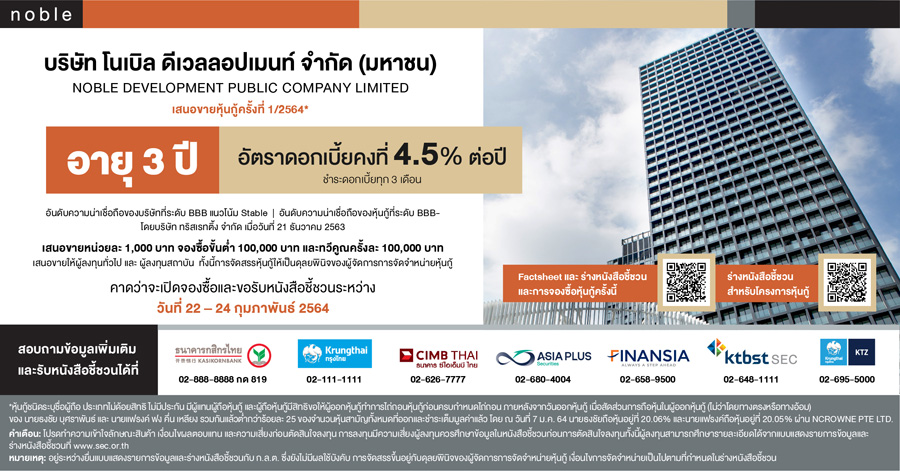 โนเบิลฯ ออกหุ้นกู้ครั้งที่ 1/2564 เตรียมเปิดขาย 22-24 ก.พ. นี้ ตั้งเป้า 3 ปีติด 1 ใน 5 ผู้นำตลาดอสังหาฯ