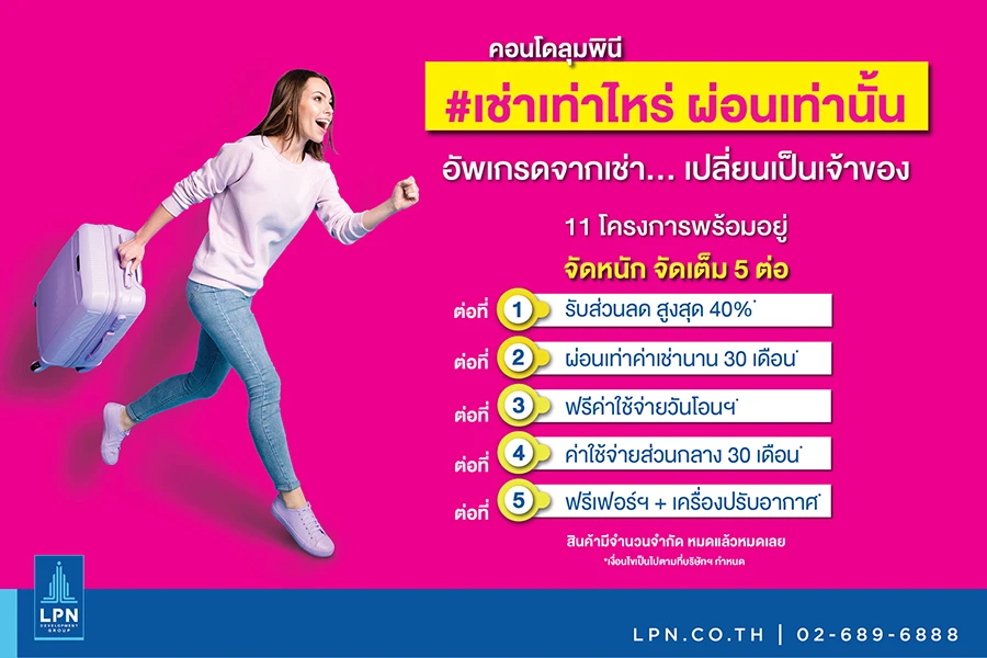 บริษัท แอล.พี.เอ็น.ดีเวลลอปเมนท์ จำกัด(มหาชน)(LPN) ส่งเสริมคนไทยมีบ้านเป็นของตัวเอง เปลี่ยนจากค่าเช่าบ้านเป็นค่าผ่อนบ้านแทน สร้างโอกาสให้คนไทยมีบ้านได้ง่ายขึ้นในราคาที่จับต้องได้ (Affordable Price) ด้วยแคมเปญใหม่ "#เช่าเท่าไหร่ ผ่อนเท่านั้น" โดย LPN จะช่วยลูกค้าผ่อนค่างวดกับสถาบันการเงินเป็นเวลา 30 เดือน เริ่มตั้งแต่ 3,200-13,000 บาท ขึ้นอยู่กับทำเลที่ตั้งของคอนโดมิเนียมทั้ง 11 โครงการ ที่เข้าร่วมแคมเปญ