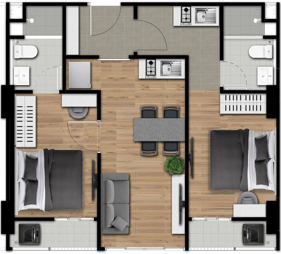 สำหรับแบบห้องแบบ Dual Key เป็นการนำสองยูนิตมารวมกันไว้ในห้องเดียว แต่มีการแยกสัดส่วนกันอย่างชัดเจน โดยไม่สามารถเดินไปหากันระหว่างห้องได้ หากไม่มีกุญแจสำหรับห้องนั้น ซึ่งเป็บแบบห้องที่ได้รับความนิยมสูงในหลายประเทศ โดยเฉพาะสิงคโปร์ และฮ่องกง เพราะเป็นแบบห้องที่เหมาะสำหรับกลุ่มผู้อยู่อาศัยที่เป็นครอบครัวใหญ่ และกลุ่มผู้ซื้อที่ต้องการปล่อยเช่า หรือ กลุ่มฟรีแลนซ์ ที่ต้องการใช้อีกส่วนหนึ่งเป็นที่ทำงานติดกับที่พักอาศัยก็สามารถทำได้ด้วย
