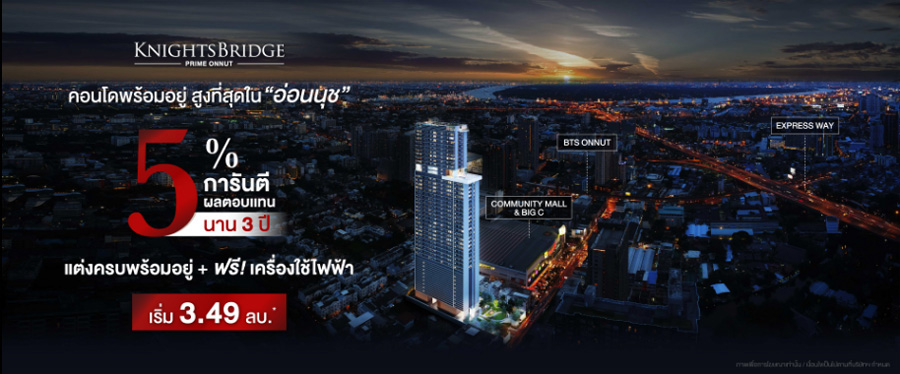 ไนท์บริดจ์ ไพร์ม อ่อนนุช (Knightsbridge Prime Onnut) คอนโดพร้อมอยู่เดินทางสะดวกคอนโดใกล้รถไฟฟ้า BTS อ่อนนุช และใกล้ทางด่วน 2 จุด สัมผัสวิวโค้งแม่น้ำจากมุมมองที่สูงที่สุดในอ่อนนุช โครงการ High-Rise ความสูง 47 ชั้น 1 อาคาร จำนวน 600 ยูนิต โปร่งสบายด้วยห้องเพดานสูง 3 เมตร ส่วนกลางลอยฟ้าพื้นที่มากกว่า 1,000 ตารางเมตร พร้อมระบบจอดรถอัตโนมัติแบบ Auto Parking จอดรถได้มากถึง 65% ใกล้ BIG C อ่อนนุช, CENTURY MOVIE PLAZA อ่อนนุช ,TESCO LOTUS อ่อนนุช, โรงเรียนนานาชาติ BANGKOK PREP และ SAINT ANDREW