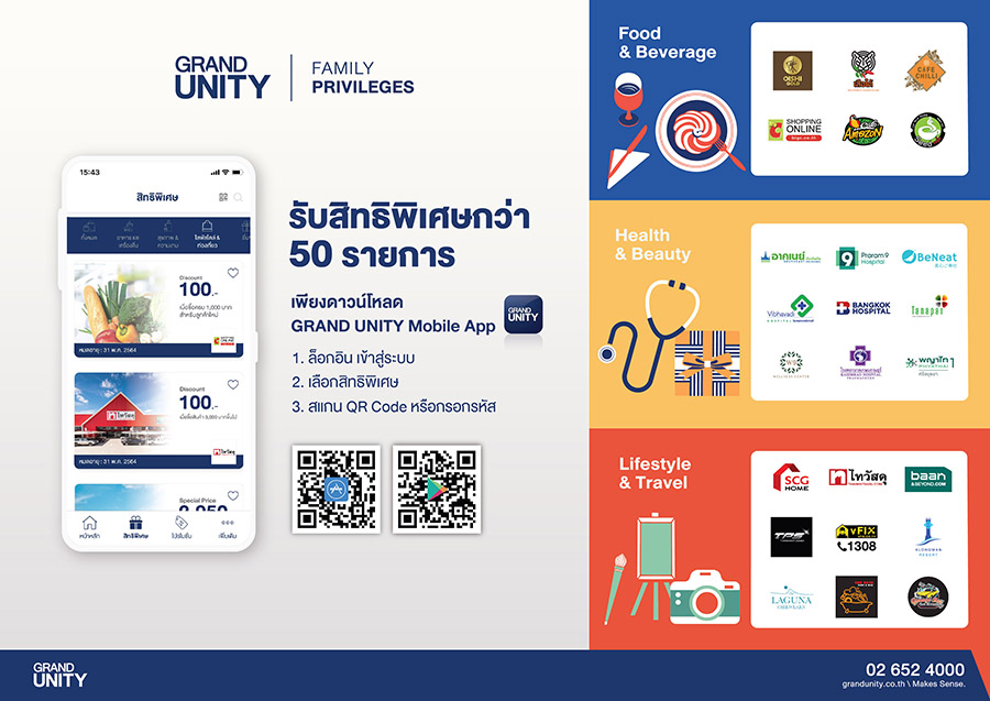 3. ไลฟ์สไตล์และการท่องเที่ยว (Lifestyle & travel) ให้สมาชิก GRAND UNITY FAMILY ได้ดำเนินชีวิตประจำวันได้อย่างมั่นใจสอดรับกับวิถีการใช้ชีวิตในคอนโดมิเนียมในยุค now normal ด้วยสิทธิพิเศษและการบริการ Cleaning Solution ต่างๆ รวมถึงโปรโมชั่นสินค้าเพื่อบ้านในราคาพิเศษจาก SCG HOME, ไทยวัสดุ, บ้านแอนด์บียอน, Vfix, BeNeat, Tanapat, Car Bath Wash & Wax, Garage Bar Car Detailing และ The Perfect Shine อีกทั้งยังร่วมกับพาร์ทเนอร์ที่พัก รีสอร์ทเรตติ้งระดับ 5 ดาว จากนักท่องเที่ยวอย่าง Klongwan Resort และ The Laguna Chiewlarn ที่พร้อมมอบสิทธิพิเศษและส่วนลดในราคาสุดพิเศษ
