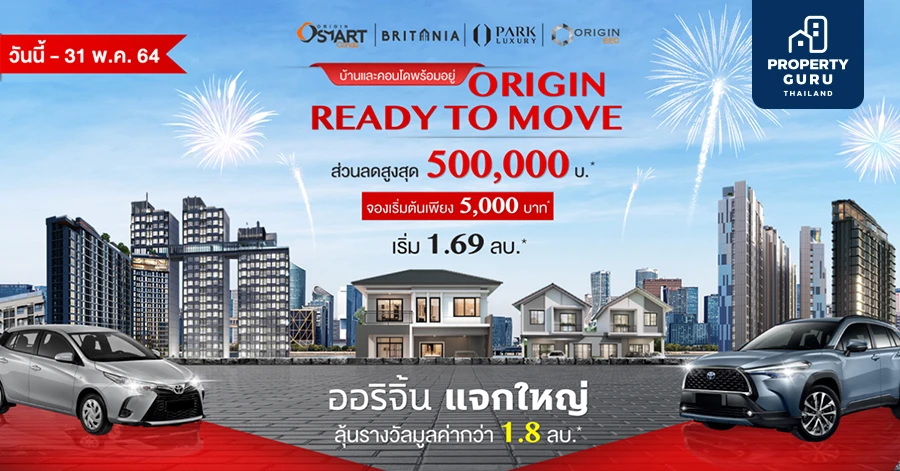 ออริจิ้น พร็อพเพอร์ตี้ จัดแคมเปญใหญ่ "ออริจิ้น Ready To Move" ซื้อบ้านและคอนโดฯ พร้อมอยู่ ลุ้นรับรางวัลมูลค่ากว่า 1.8 ล้านบาท ORIGIN Ready To Move ส่วนลดสูงสูด 500,000 บาท* จองเริ่มต้นเพียง 5,000 บาท* เริ่ม 1.69 ลบ.* สำหรับลูกค้าที่จองทำสัญญาและโอนกรรมสิทธิ์ โครงการคอนโดมิเนียมและบ้านพร้อมอยู่ ทุกแบรนด์ในเครือออริจิ้น ตั้งแต่วันนี้ ถึงวันที่ 31 พ.ค. 2564 ประกาศรายชื่อผู้โชคดีในวันศุกร์ที่ 18 มิถุนายน 2564 (เงื่อนไขเป็นไปตามที่บริษัทฯกำหนด)